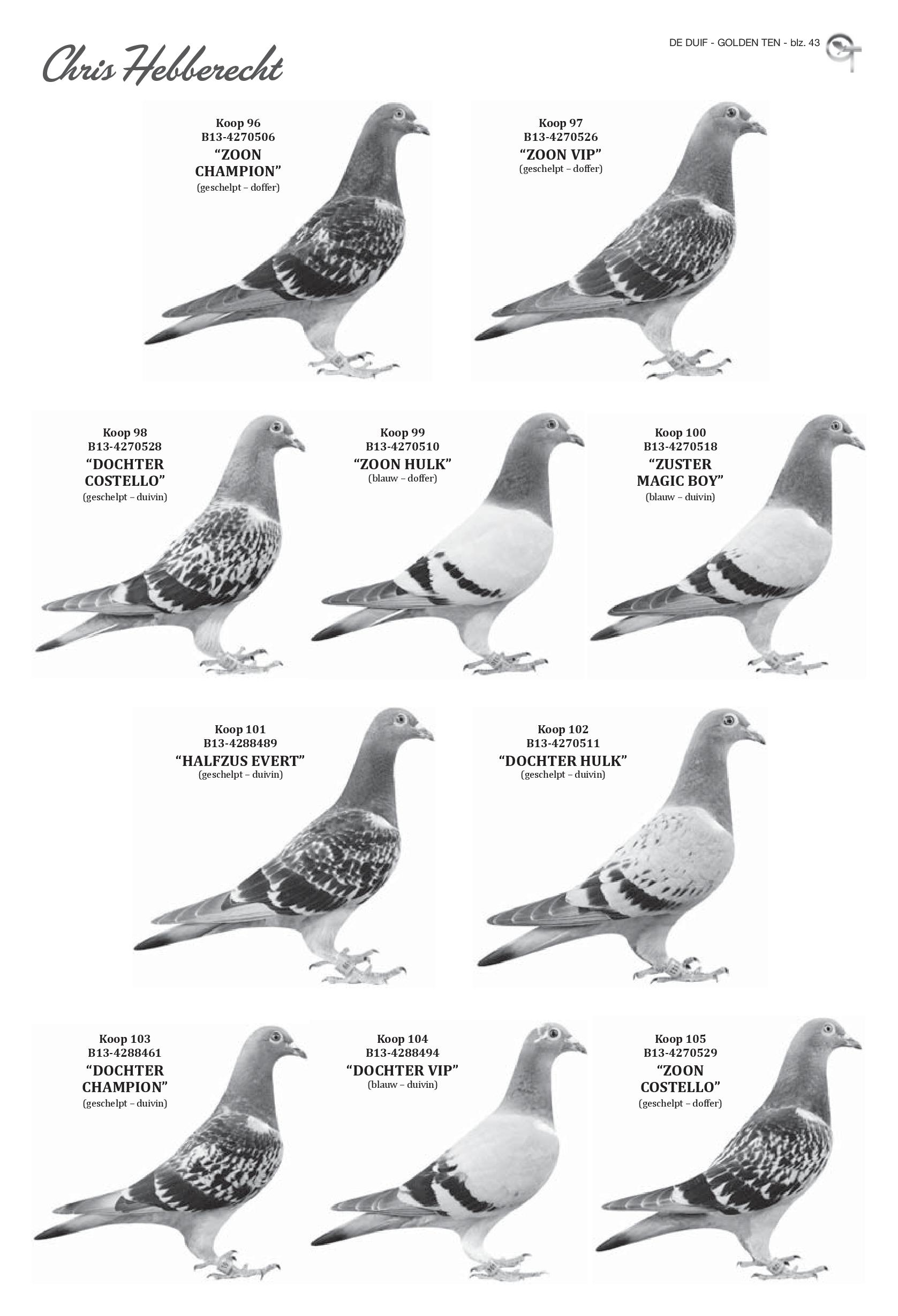 KBDB鴿王省賽4位、阿爾比98羽1位、阿爾比5063羽全國50位、伊倫5846羽全國14位、伊倫15627羽國際26位、橘郡6035羽全國65位、加索爾7608羽國際62位、塔布斯4864羽全國17位
