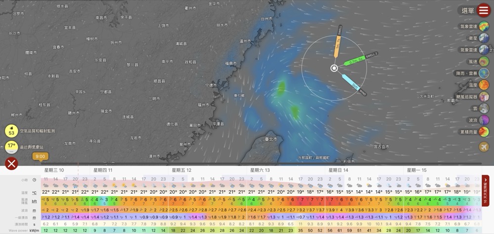 Windy當前天氣資料,下方按鈕可托拉調整查詢時間